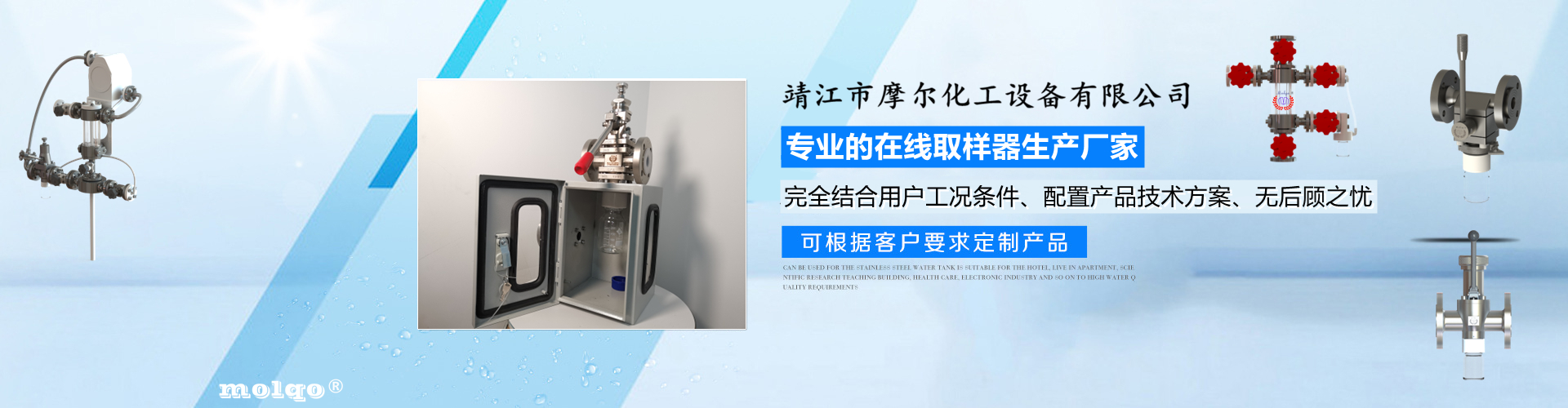 靖江市摩爾化工設(shè)備有限公司位于蘇中明珠——江蘇省靖江市城南工業(yè)園區(qū)東進(jìn)路北側(cè)天元艾爾瑞內(nèi),另有生產(chǎn)基地位于靖江市經(jīng)濟技術(shù)開發(fā)區(qū)新號路1號鼎電科技園內(nèi)。我公司由數(shù)名長期從事化工生產(chǎn)、氟塑襯里模具開發(fā)以及機械自控設(shè)備的專業(yè)人員共同合作成立,致力于提供客戶最優(yōu)的高效在線取樣、反應(yīng)及精餾分離設(shè)備,為客戶提供合理的設(shè)備選型方案,以幫助客戶提高綜合生產(chǎn)效率以及改善生產(chǎn)現(xiàn)場環(huán)境為目標(biāo)。 本公司主要制造及銷售的產(chǎn)品有:釜用在線取樣裝置,管道取樣閥,釜用清洗噴淋裝置、搪玻璃設(shè)備、GMP專用搪玻璃設(shè)備、氟塑襯里設(shè)備、攪拌器、釜用機械密封、氣動閥門及搪玻璃管道、襯氟閥門管道、非標(biāo)不銹鋼容器,精餾塔塔器、片式冷凝器及PTFE密封件、鋯、鈦、鉭、鎳等加工件制品。我司是一家集研發(fā)銷售、設(shè)計咨詢服務(wù)于一體的專業(yè)···